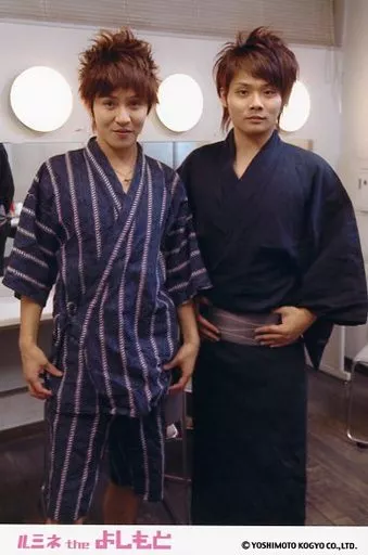 Japanese title: 生写真(男性)/お笑いタレント サカイスト/酒井デンペー・酒井将芳/膝上・浴衣青・デンペー両手下げ・将芳両手帯・後ろ鏡・ポストカードサイズ・「ルミネtheよしもと」/公式生写真