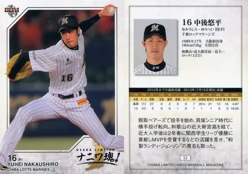 Japanese title: BBM/レギュラーカード/千葉ロッテマリーンズ/BBM2013 ベースボールカード OSAKA LIMITED ナニワ魂 52[レギュラーカード]:中後悠平
