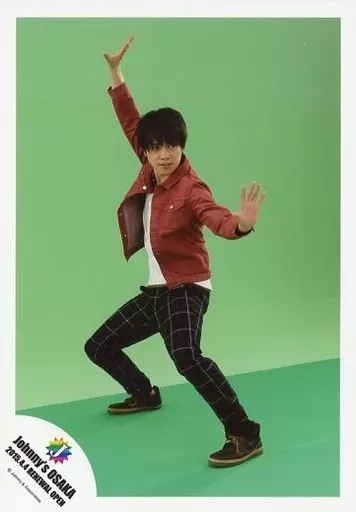Official photo (Johnnys) / idol / Johnny's West Johnny's West / Daiki Shigeoka / Whole body, costume red, white, black, body facing left, both hands lifted, posture, background green and logo "Johnny's Official photo 2015.4.4 RENEWAL OPEN" / Johnnys Shop Osaka Store Limited Time Official Osaka