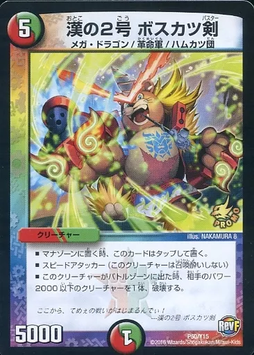 Japanese title: デュエルマスターズ/プロモ/多色/デュエル・マスターズ全国大会 革命ファイナルカップ 全国店舗予選参加賞 P50/Y15[プロモ]:漢の2号 ボスカツ剣