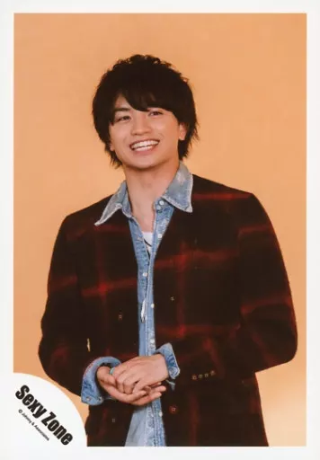 Japanese title: 生写真(ジャニーズ)/アイドル/Sexy Zone Sexy Zone/中島健人/上半身・衣装黒・赤・チェック柄・青・両手重ね・歯見せ・背景茶色/「よびすて」PV&ジャケ写撮影/公式生写真