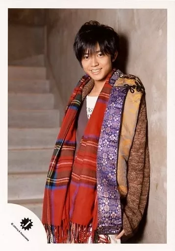 Japanese title: 生写真(ジャニーズ)/アイドル/なにわ皇子 なにわ皇子/永瀬廉/膝上・衣装茶・青・マフラー赤チェック柄・体左向き・両手下・階段/公式生写真