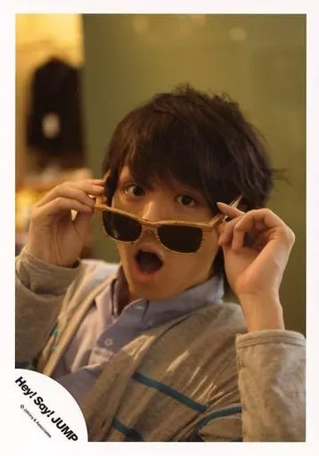 Japanese title: 生写真(ジャニーズ)/アイドル/Hey! Say! JUMP Hey! Say! JUMP/伊野尾慧/バストアップ・衣装グレー・青シャツ・両手サングラス・口開け・カメラ目線/公式生写真