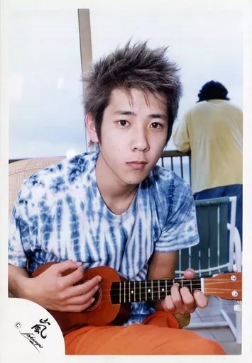Japanese title: 生写真(ジャニーズ)/アイドル/嵐 嵐/二宮和也/膝上・座り・衣装青・白・オレンジ・ストライプ柄・両手ギター/公式生写真