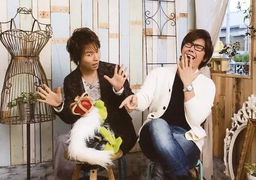 Japanese title: 生写真(男性)/声優 代永翼・佐藤拓也/横型・膝上・椅子座り・衣装白・黒・デニム・両手パー・左手口・右手指差し/声優イベント「第49回王様ジャングル」販売ブロマイド