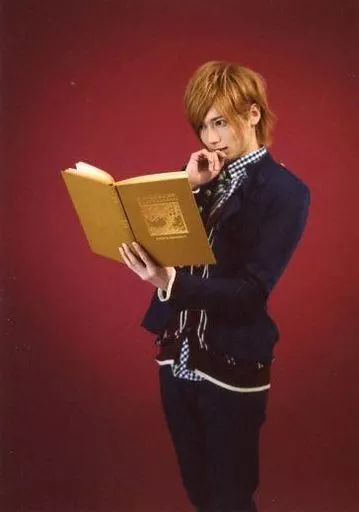 Japanese title: 生写真(男性)/俳優 染谷俊之/膝上・衣装青・白・赤・ネクタイ・左向き・左手本・右手口元・背景赤/舞台「CORNFLAKES 第11回公演 グッバイシェイクスピア!!!」
