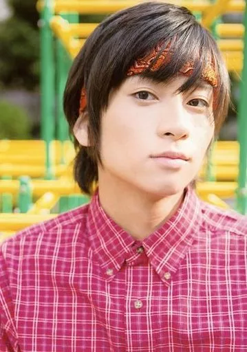 Official photo (male) / actor Yoshihiko Aramaki / Bust up / Costume red / white / Check pattern / Bandana wrap around head / Face slightly right / Background play equipment / Official Official photo