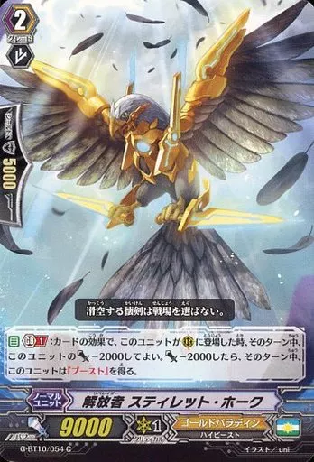 Japanese title: ヴァンガード/C/ノーマルユニット/ゴールドパラディン/ヴァンガードG ブースターパック 第10弾「剣牙激闘」 G-BT10/054[C]:解放者 スティレット・ホーク