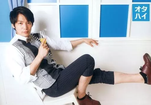 Japanese title: 生写真(男性)/俳優 磯貝龍虎/横型・全身・座り・衣装白・黒・チェック柄・蝶ネクタイ・右向き・右手飲み物・椅子・背景白青/舞台「オタッカーズ・ハイ」個人セット