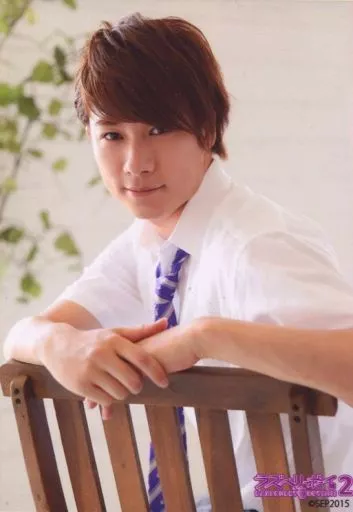 Japanese title: 生写真(男性)/俳優 小野一貴/上半身・衣装白・両手重ね・左向き・植物・背景白/舞台「ラズベリーボーイ2 再演」ブロマイド(衣装)