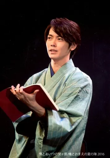 Japanese title: 生写真(男性)/俳優 猪塚健太/ライブフォト・上半身・衣装グレー・和服・左向き・左手本・背景黒・夏の陣Ver./朗読劇「僕とあいつの関ケ原/俺とおまえの夏の陣 2016」舞台生写真