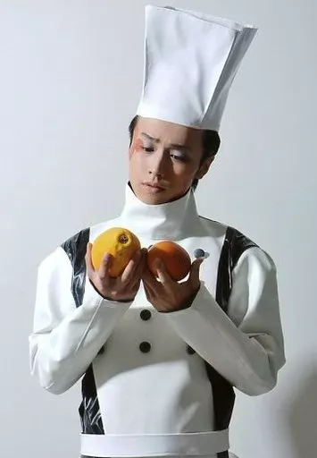 Japanese title: 生写真(男性)/俳優 鈴木勝吾(コック900)/上半身・衣装白・両手果物・目線下・背景グレー・キャラクターショット/舞台「SHATNER of WONDER #1 ロボ・ロボ」