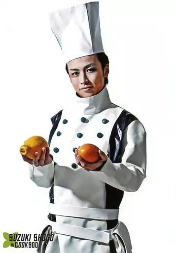 Japanese title: 生写真(男性)/俳優 鈴木勝吾(コック900)/膝上・衣装白・両手果物・背景白・キャラクターショット/舞台「SHATNER of WONDER #1 ロボ・ロボ」キャスト先行枠チケット特典ブロマイド