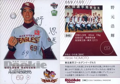 BBM / Regular Card / Tohoku Rakuten Golden Eagles / BBM2017 RookIe Edition 040 [Regular Card] : Hiroki Nomoto (Silver hot stamping with signature) (/ 100)
