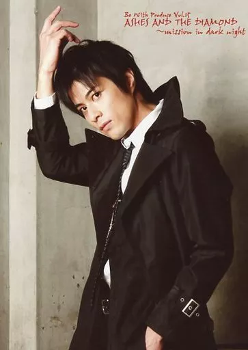 Official photo (male) / actor Manabu Shindo / Above-the-knee / Costume black / white / Necktie / Right hand head / Left hand pocket / Body facing left / Neck tilted / Background grey / 2L size / Stage "Ash and Diamond ~ mission in dark night" Official photo