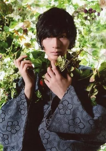 Japanese title: 生写真(男性)/俳優 荒牧慶彦(明)/上半身・衣装グレー.黒・両手上げ.植物・カメラ目線/極上文學「草迷宮」ランダムブロマイド