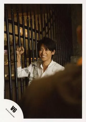 Japanese title: 生写真(ジャニーズ)/アイドル/V6 V6/坂本昌行/バストアップ・シャツ白グレー・右手グー柵・歯見せ・手前に人/公式生写真