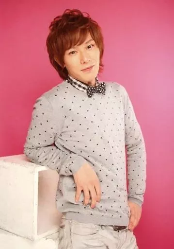 Japanese title: 生写真(男性)/俳優 小谷嘉一/上半身・衣装グレー・水玉模様・チェック柄・蝶ネクタイ・右手台の上・左手腰・体右向き・背景ピンク/中村誠治郎&小谷嘉一 仲良しトークライブ 会場限定物販生写真