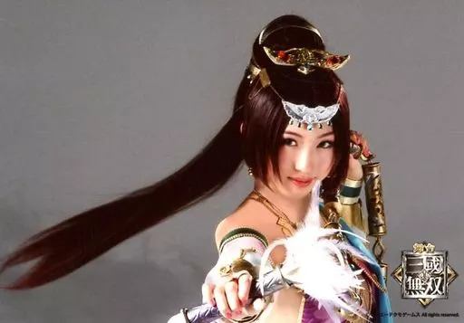 Japanese title: 生写真(女性)/ミュージシャン 日比美思(貂蝉)/横型・バストアップ・体右向き・右手前・両手武器持ち・背景グレー・キャラクターショット/舞台「真・三國無双」ランダムブロマイド