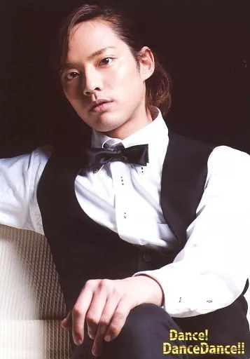 Official photo (male) / actor Kazumi Doi / upper body, sitting, costume white, black, left knee, background black / film "Dance! DanceDance!" Bromide