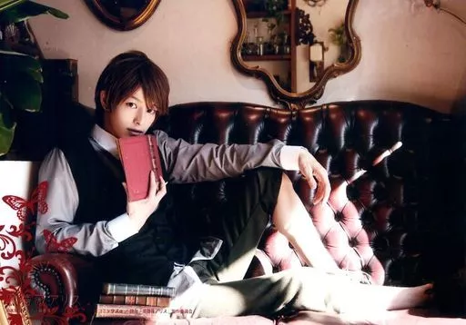 Japanese title: 生写真(男性)/俳優 杉江大志(櫂)/横型・全身・座り・衣装黒・グレー・白・右手本・キャラクターショット/舞台「黒薔薇アリス」生写真