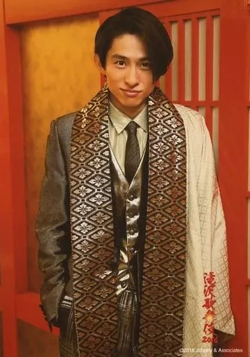 Japanese title: 生写真(ジャニーズ)/アイドル/V6 V6/三宅健/上半身・衣装グレー・銀・白・着物・両手ポケット・背景赤格子/滝沢歌舞伎 2016
