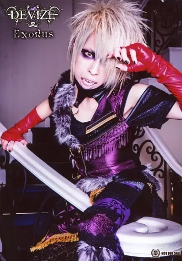 Japanese title: 生写真(男性)/ヴィジュアル系バンド/DEVIZE DEVIZE/teoh(テオ)/膝上・座り・衣装黒紫・左手顔・階段/CD「Exodus」自主盤倶楽部特典生写真