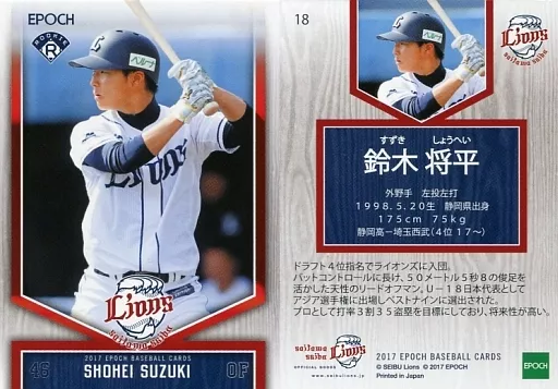 Japanese title: スポーツ/レギュラーカード/EPOCH ベースボールカード 2017 埼玉西武ライオンズ 18 [レギュラーカード] : 鈴木将平(打者)(腰上)