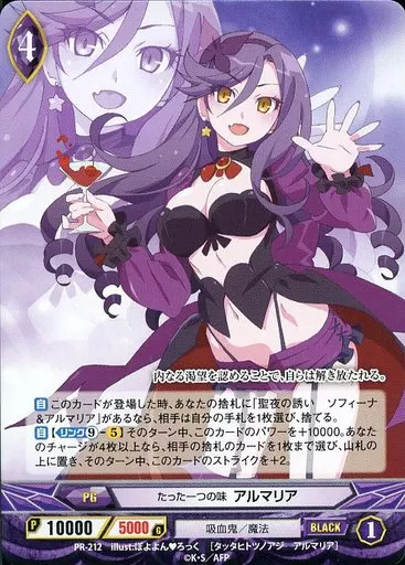 Japanese title: アンジュ・ヴィエルジュ/PR/黒/PG/吸血鬼/魔法/「アンジュ・ヴィエルジュ」Blu-ray/DVD BOX-2 初回生産限定版特典 スペシャルカードセット「血の盟友」 PR-212[PR]:たった一つの味 アルマリア