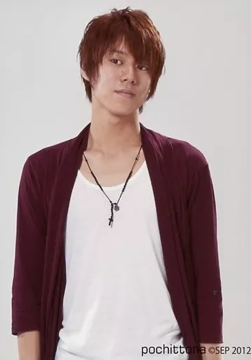 Japanese title: 生写真(男性)/俳優 伊勢大貴(関圭太)/上半身・衣装白・赤紫・首傾げ・目線左・背景白/舞台「ポチッとな。-Swittching On Summer-」ブロマイド
