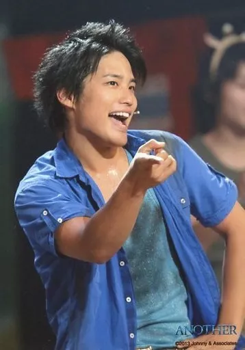Kansai Johnnys Jr. / Terufumi kiriyama / Live Photo / Upper Body / Costume Blue / fingers of the right hand Holder / Left Hand Hip / Mouth Opening / ANOTHER 2013 Stage Photo