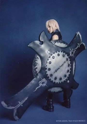 Japanese title: 生写真(女性)/歌手 ナナヲアカリ(マシュ・キリエライト)/全身・左向き・衣装黒・盾・背景青・キャラクターショット/舞台「Fate/Grand Order THE STAGE -神聖円卓領域キャメロット-」キャストブロマイド