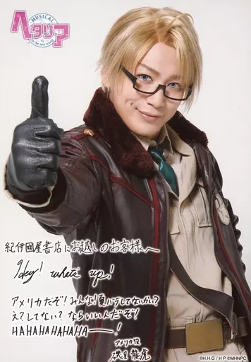 Japanese title: 生写真(男性)/俳優 磯貝龍虎(アメリカ)/印刷メッセージ入り・キャラクターショット/ミュージカル「ヘタリア~in the new world~」開幕記念フェア 「ヘタリア」関連書籍購入者特典 紀伊国屋書店限定ブロマイド