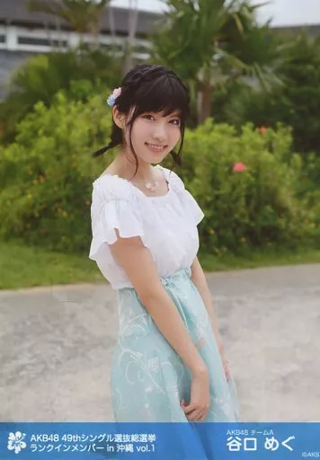 Japanese title: 生写真(AKB48・SKE48)/アイドル/AKB48 谷口めぐ/膝上・衣装白水色・両手下・体右向き/AKB48 49thシングル 選抜総選挙~まずは戦おう!話はそれからだ~ ランクインメンバー ロケ生写真 in沖縄 vol.1