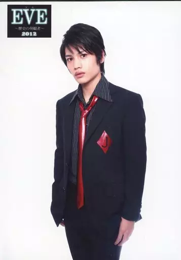 Japanese title: 生写真(男性)/俳優 河原田巧也/膝上・衣装黒・ネクタイ赤・左向き・両手下・背景白/舞台「EVE~歴史の傍観者~」