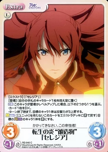 Japanese title: カオス/C/Extra/光/ブースターパック Re:CREATORS RE-046[C]:転生の炎“被造物”「セレジア」