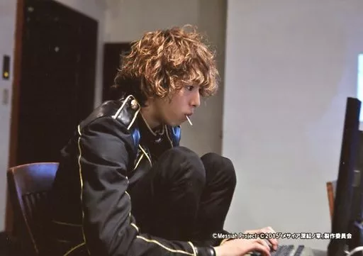 Official photo (male) / actor Taishi Sugie (Kazumi Itsuki) / Landscape, Above the Knees, Sitting, Costume Black, Candy Mouth, Both Hands Keyboard, Body Facing Right / Movie' Messiah - Crimson Tale -' Advance Ticket Purchase benefits