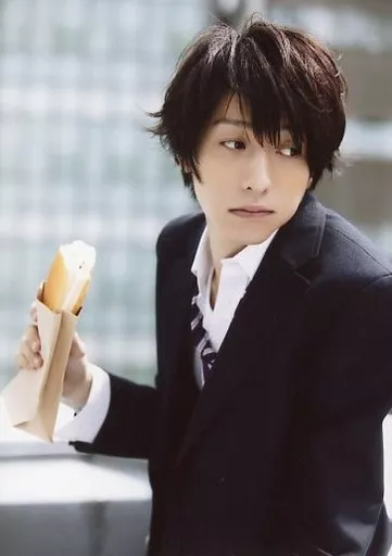 Japanese title: 生写真(男性)/俳優 鈴木拡樹/上半身・衣装制服・黒・白・体左向き・顔右向き・右手にパン/イベント「秋の特別授業 in 拡學」販売ブロマイド