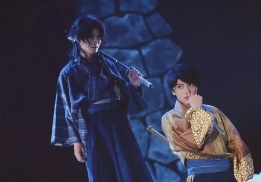 Official photo (male) / actor Ryujiro Izaki (Beppu Shinsuke), Ryo Matsuda (Hanjiro NAKAMURA) / Live Photo, Horizontal Type, Above the Knee, Costume Blue, Brown, Isaki Kaoteki / Stage 「 Kenku Ookami Kuroki Kamo 」 Random Stage Photo