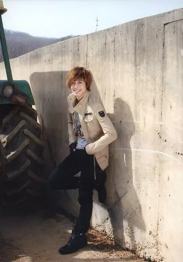 Japanese title: 生写真(男性)/俳優 キム・ヒョンジュン/全身・衣装ベージュ・左向き・右足曲げ・両手ポケット・野外/「F4写真集 SOFF:Story Of Four Flowers」生写真