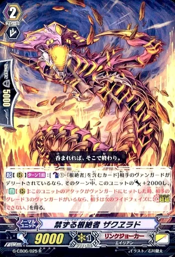 Japanese title: ヴァンガード/R/ノーマルユニット/リンクジョーカー/ヴァンガードG クランブースター 第6弾「混沌と救世の輪舞曲」 G-CB06/025[R]:禁ずる根絶者 ザクヱラド