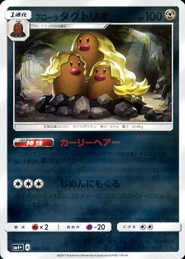 Japanese title: ポケモンカードゲーム/鋼/サン&ムーン ハイクラスパック GXバトルブースト 067/114:(キラ)アローラダグトリオ