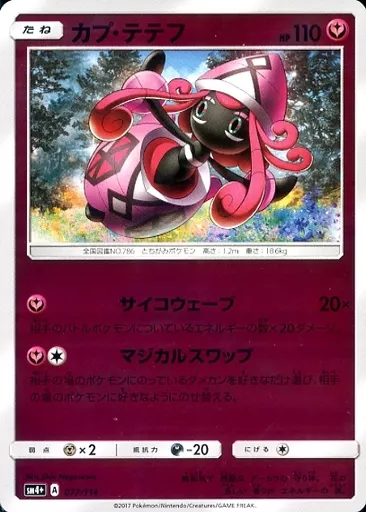 Japanese title: ポケモンカードゲーム/フェアリー/サン&ムーン ハイクラスパック GXバトルブースト 077/114:(キラ)カプ・テテフ