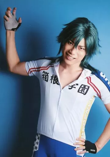Official photo (male) / actor Kentarou Kanesaki (Masakiyo DOBASHI) / Above the Knee / Uniform / Right Hand Up / Left Hand Back / Background Blue / Character Actor Shot / Stage 『 YOWAMUSHI PEDAL 』 New Inter-High ~ Heat Up ~ Trading Bromide