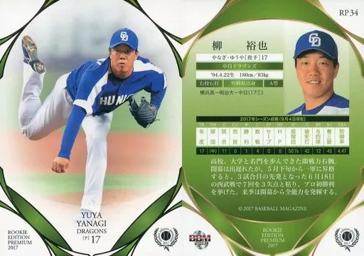 Japanese title: BBM/レギュラーカード/中日ドラゴンズ/BBM2017 ルーキーエディション プレミアム RP34[レギュラーカード]:柳裕也