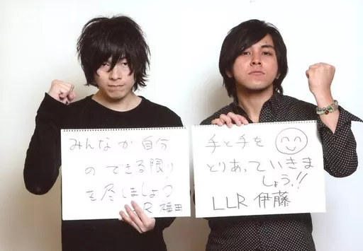 Official photo (Male) / Comedian LLR / Megumi Fukuda, Tomohiro Ito / Yokogata, Upper Body, Black Costume, Flip, one handed Rock / Namasha