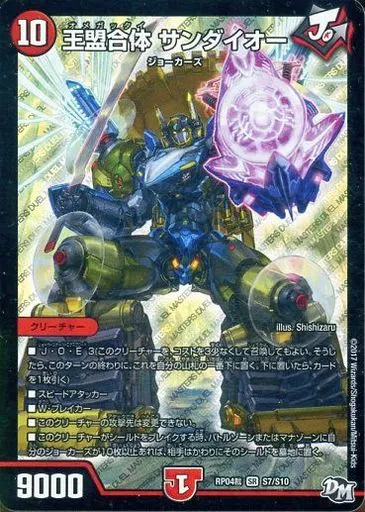 Japanese title: デュエルマスターズ/SR/火/[DMRP-04]拡張パック新4弾 誕ジョー! マスター・ドラゴン!! ~正義ノ裁キ~ S7/S10[SR]:王盟合体 サンダイオー
