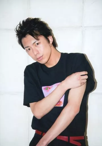 Japanese title: 生写真(男性)/俳優 北園涼/上半身・衣装黒ピンク・右手左腕・顔斜め左向き・背景白/北園涼プロデュース solid perfume『Anita』発売イベント会場販売生写真