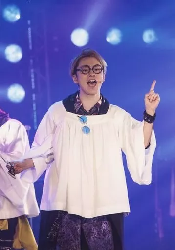 Masatsugu Ryochi (Abraham) / Live photo, above the knee, costume white purple, Kappogi, glasses, left hand index finger stand, background purple / Stage "ARTHUR BOYZ" God-only known random photo set STAGE ver. (LEGACY)