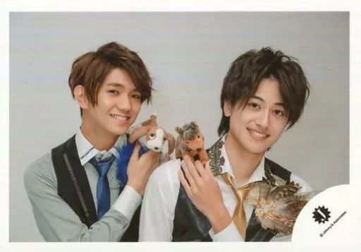 Japanese title: 生写真(ジャニーズ)/アイドル/関西ジャニーズJr. 関西ジャニーズJr./正門良規・小島健/横型・バストアップ・衣装白黒グレー・肩に犬のマスコット置く/18初春 関西ジャニーズJr. コンサートグッズ撮影オフショット/公式生写真